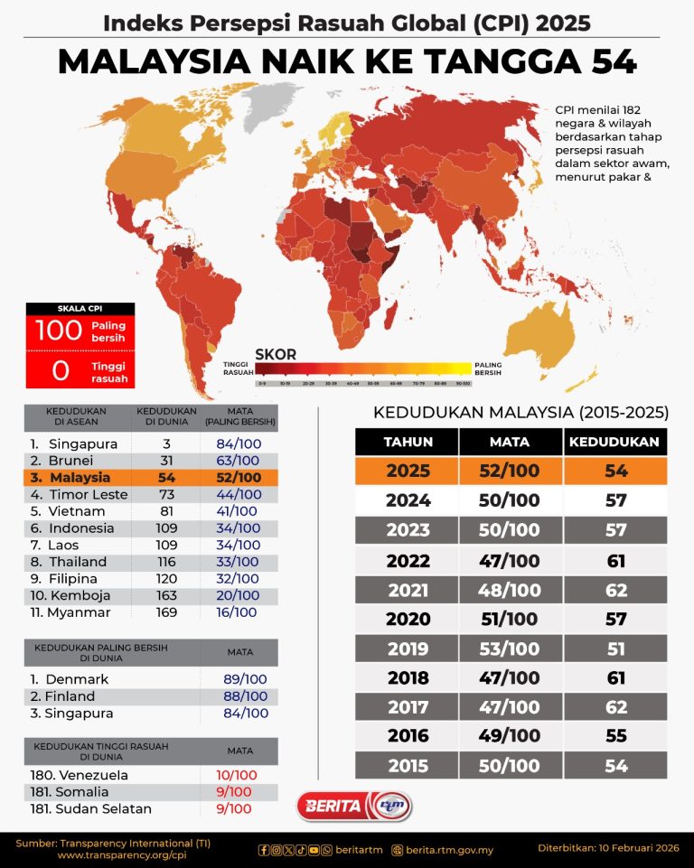 INDEKS PERSEPSI RASUAH GLOBAL (CPI) 2025, MALAYSIA NAIK KE TANGGA 54