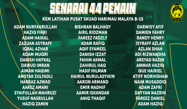 KUALA LUMPUR, 20 Jun-Persatuan Bolasepak Malaysia (FAM) hari ini mengumumkan senarai 44 pemain yang dipanggil menyertai kem latihan pusat skuad Harimau Malaya Bawah 15 tahun (B-15) sebagai persiapan menghadapi Kejohanan Emerging Socceroos 2025 yang dijadual berlangsung di Melbourne, Australia, dari 4 hingga 12 Julai depan.