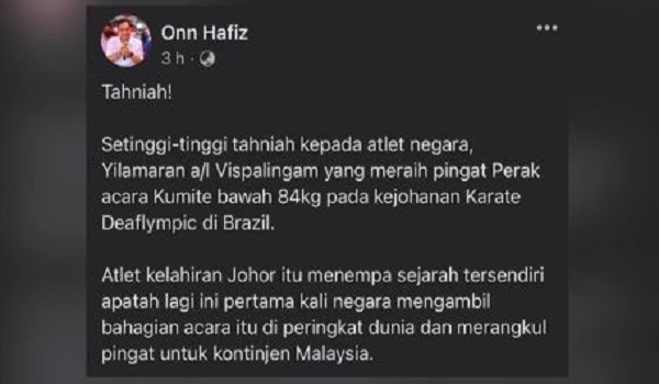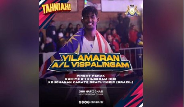 “Setinggi-tinggi tahniah kepada atlet negara, Yilamaran a/l Vispalingam yang meraih pingat perak acara kumite bawah 84 kilogram pada kejohanan Karate Deaflympic di Brazil.