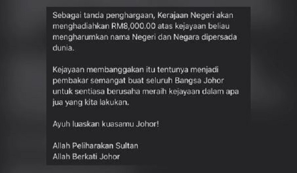 (Menteri Besar Johor, Datuk Onn Hafiz Ghazi memaklumkan mengenai insentif yang diberikan kepada Yilamaran menerusi hantaran Facebooknya)