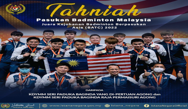 KUALA LUMPUR, 21 Februari – Yang di-Pertuan Agong, Al-Sultan Abdullah Ri’ayatuddin Al-Mustafa Billah Shah dan Raja Permaisuri Agong, Tunku Hajah Azizah Aminah Maimunah Iskandariah menzahirkan ucapan tahniah kepada skuad badminton lelaki kebangsaan atas kejayaan menjuarai Kejohanan Badminton Berpasukan Asia (BATC) 2022, semalam.