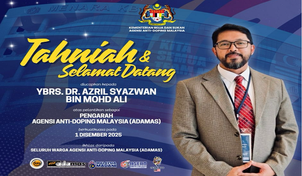 KUALA LUMPUR, 1 Disember – Agensi Anti-Doping Malaysia (ADAMAS) mengumumkan pelantikan Dr Azril Syazwan Mohd Ali sebagai pengarah baharu agensi itu berkuat kuasa hari ini.