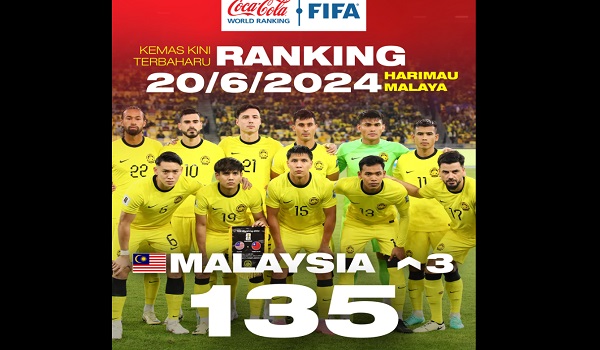 KUALA LUMPUR, 20 Jun- Kemas kini terbaharu ranking Persekutuan Bolasepak Antarabangsa (FIFA) hari ini menunjukkan skuad Harimau Malaya melonjak tiga anak tangga untuk menduduki tempat ke-135 dunia.
