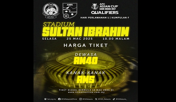 “Tiket perlawanan berharga RM40 untuk dewasa dan RM5 bagi kanak-kanak berusia 6 hingga 12 tahun mula dijual secara dalam talian di laman web www.tickethotline.com.my bermula hari ini, Khamis, 13 Mac 2025, pada jam 10 pagi,” menurut kenyataan tersebut.