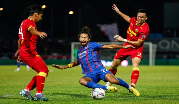 (Pemain Johor Darul Ta’zim La’vere Lawrence Corbin- Ong (tengah) diasak oleh pemain Selangor FC Quentin Cheng Jiun Ho (kanan)