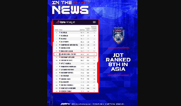 Perkembangan ini dikongsikan menerusi laman Facebook rasmi JDT, berdasarkan statistik yang dikeluarkan oleh laman bola sepak terkemuka, Opta Power Ranking.