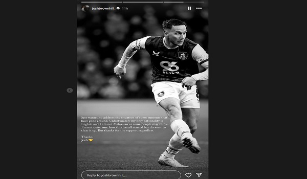 KUALA LUMPUR, 29 Disember- Ketua pasukan kelab bola sepak Burnley, Josh Brownhill hari ini menafikan khabar angin yang tular di media sosial mengenai kewarganegaraannya, yang dikaitkan dengan Malaysia.