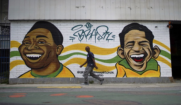 (Mural yang menggambarkan bekas juara dunia Brazil Pele (kiri) dan Garrincha (kanan)