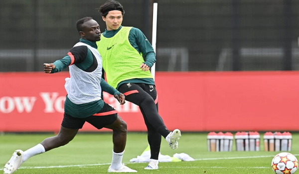 (Pemain Liverpool, Takumi Minamino (kanan) giat berlatih bersama rakan sepasukan, Sadio Mane