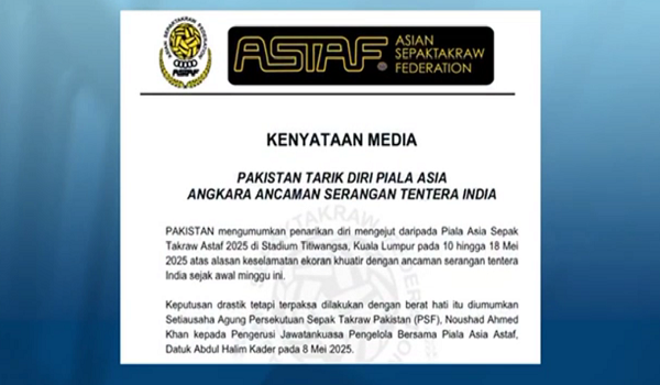 KUALA LUMPUR, 8 Mei – Pasukan Pakistan menarik diri saat akhir daripada Kejohanan Piala Asia Sepak Takraw ASTAF 2025, susulan ancaman serangan tentera India yang menyebabkan lapangan terbang antarabangsa di Islamabad ditutup.