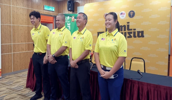 (Pemain golf negara Ng Jing Xuen(paling kanan dan Ervin Chang(kiri) pada sidang media kontinjen Malaysia di MSN/BERNAMA)