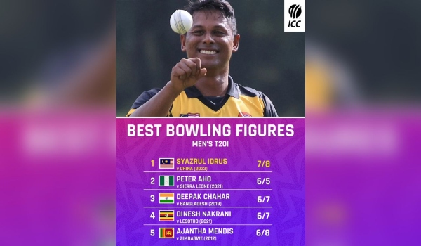 “Dia yang menggunakan balingan tangan kanannya membolosi barisan pemukul China di Bayuemas seorang diri, mengumpul tujuh wiket daripada tujuh balingan dengan pasukan pelawat tersingkir selepas hanya membuat 23 larian daripada 12 over,” kata ICC.