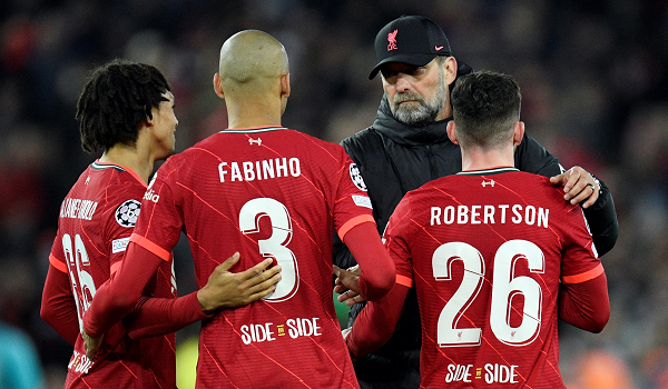 (Pengendali Liverpool, Jurgen Klopp bersama anak buahnya Alexander Arnold, Fabinho dan Robertson/AFP)