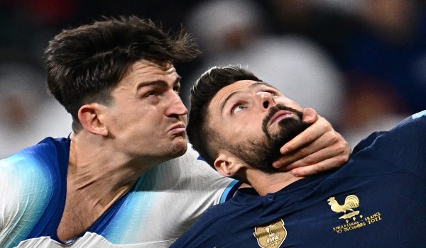 (Aksi Pertahanan England, Harry Maguire (kiri) dan Penyerang Perancis, Olivier Giroud
