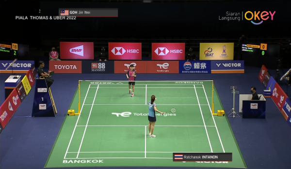 (Aksi pemain perseorangan wanita negara, Goh Jin Wei menentang pemain Thailand, Ratchanok Intanon)