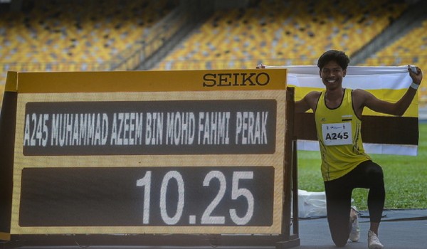 Azeem juga memegang rekod kebangsaan dengan catatan 10.09s yang dilakukan dalam Kejohanan Remaja Dunia di Cali, Colombia bulan lalu.