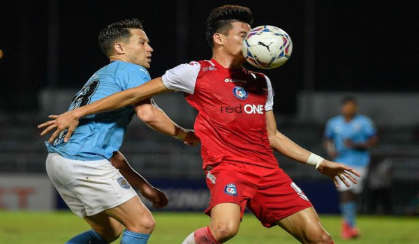 (Pemain PJ City FC Darren Yee Deng Lok (kanan) cuba menanduk bola sambil diasak oleh pemain