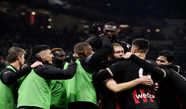 (Para pemain AC Milan raikan gol penyamaan ketika menentang Lecce/FOTO AFP)