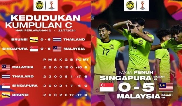 KUALA LUMPUR, 22 Julai– Skuad bola sepak Bawah 19 Tahun (B-19) kebangsaan meneruskan rentak cemerlang dengan membelasah Singapura 5-0 pada aksi kedua Kumpulan C Kejohanan B-19 ASEAN 2024 di Surabaya, Indonesia, hari ini.