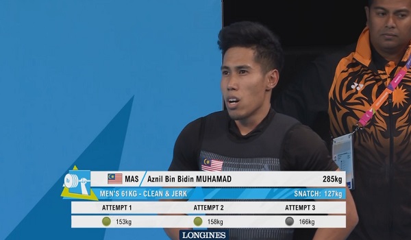 Dalam disiplin Snatch, Aznil melakukan angkatan 127kg diikuti angkatan 158kg dalam disiplin Clean And Jerk.