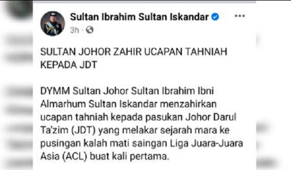 KUALA LUMPUR, 1 Mei– Kejayaan Johor Darul Takzim (JDT) melakar sejarah mara ke pusingan kalah mati Liga Juara-Juara Asia (ACL) buat kali pertama malam tadi turut menerima ucapan tahniah daripada Sultan Johor, Sultan Ibrahim Ibni Almarhum Sultan Iskandar.