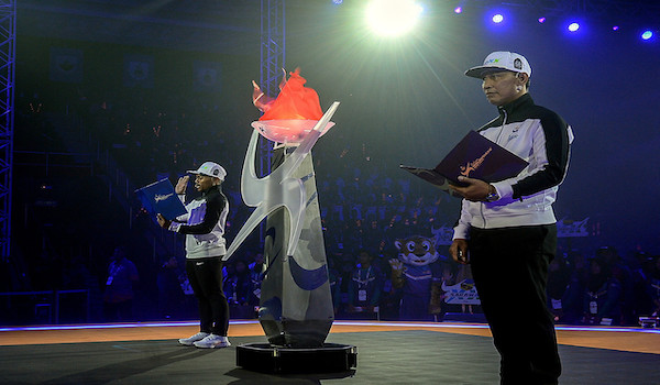 Seterusnya, obor temasya dinyalakan oleh legenda boling negara, Shalin Zulkifli diikuti bacaan ikrar yang diketuai atlet angkat berat negara, Mohamad Aniq Kasdan.
