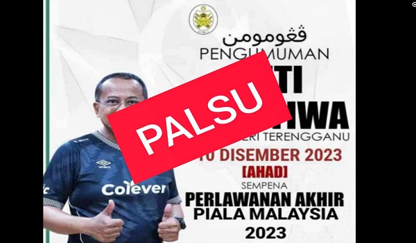 Hari ini tular di laman sosial sebuah poster yang mendakwa kononnya kerajaan negeri mengumumkan esok sebagai cuti peristiwa selepas Terengganu FC berjaya melangkah ke final Piala Malaysia menentang Johor Darul Ta’zim (JDT) semalam.