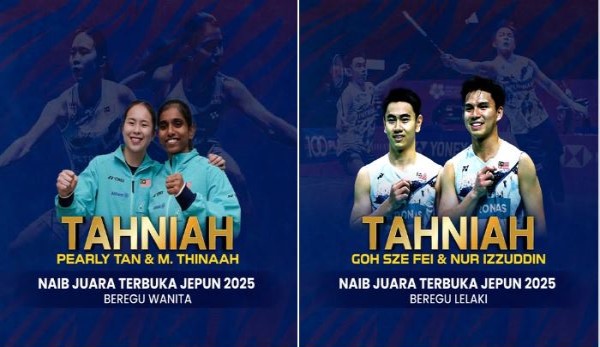 KUALA LUMPUR, 20 Julai – Timbalan Perdana Menteri, Datuk Seri Dr Ahmad Zahid Hamidi mengucapkan tahniah dan syabas kepada pasangan beregu wanita negara Pearly Tan-M. Thinaah serta beregu lelaki Goh Sze Fei-Nur Izzuddin Rumsani atas kejayaan merangkul gelaran naib juara di Terbuka Jepun 2025.