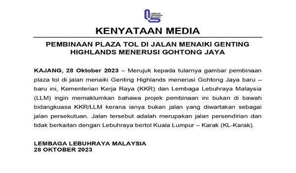 KUALA LUMPUR, 28 Oktober- Pembinaan plaza tol di jalan menaiki Genting Highlands menerusi Gohtong Jaya bukan berada di bawah bidang kuasa Kementerian Kerja Raya (KKR) dan Lembaga Lebuhraya Malaysia (LLM). LLM menerusi satu kenyataan pagi ini memaklumkan pembinaan tol berkenaan…