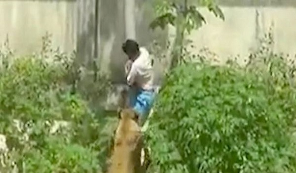 Mangsa kemudian turun ke dalam kandang menerusi sebatang pokok, sebelum ditarik seekor singa betina.