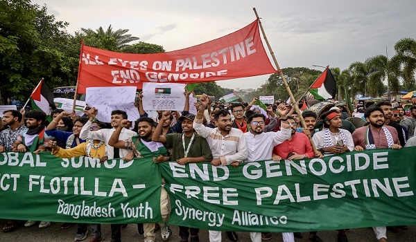 DHAKA, 3 Oktober – Ribuan umat Islam berhimpun di Dhaka pada Jumaat bagi membantah tindakan Israel memintas flotila bantuan ke Gaza dan menahan lebih 450 aktivis asing yang berada di atas kapal-kapal tersebut.