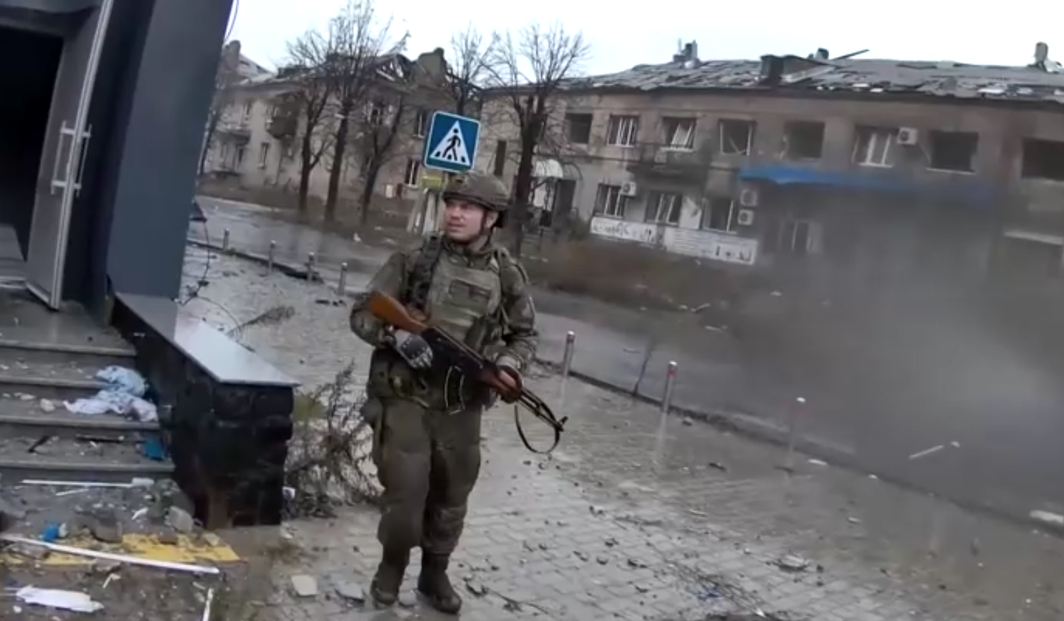 Video dikeluarkan Kementerian Pertahanan Rusia memaparkan asap tebal serta rumah yang rosak teruk dengan serpihan bertaburan di jalan.