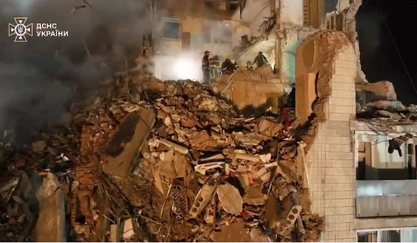 Imej yang dikeluarkan Perkhidmatan Kecemasan Ukraine menunjukkan pasukan penyelamat memeriksa bangunan yang musnah.