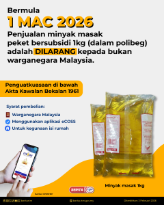 Utama Fokus Fakta Visual BERMULA 1 MAC 2026, PENJUALAN MINYAK MASAK PEKET BERSUBSIDI ADALAH DILARANG KEPADA WARGA ASING. BERMULA 1 MAC 2026, PENJUALAN MINYAK MASAK PEKET BERSUBSIDI ADALAH DILARANG KEPADA WARGA ASING.3/02/2026 | 10:14 pmFakta Visual Kongsi berita Share on X (Twitter) Share on Facebook Share on WhatsApp Share on Telegram Berita sebelumnyaHARI KANSER SEDUNIABerita seterusnya7 TAPAK RAMSAR DI MALAYSIA Pembiayaan khas BARAKAT dan BERKAT sempena Ramadan dan Tahun Baharu Cina Artikel Tajaan PALING POPULAR Jet peribadi terhempas, timbalan menteri dan empat maut Global Pemandu lori dipenjara 3 bulan, denda RM100,000 Kes