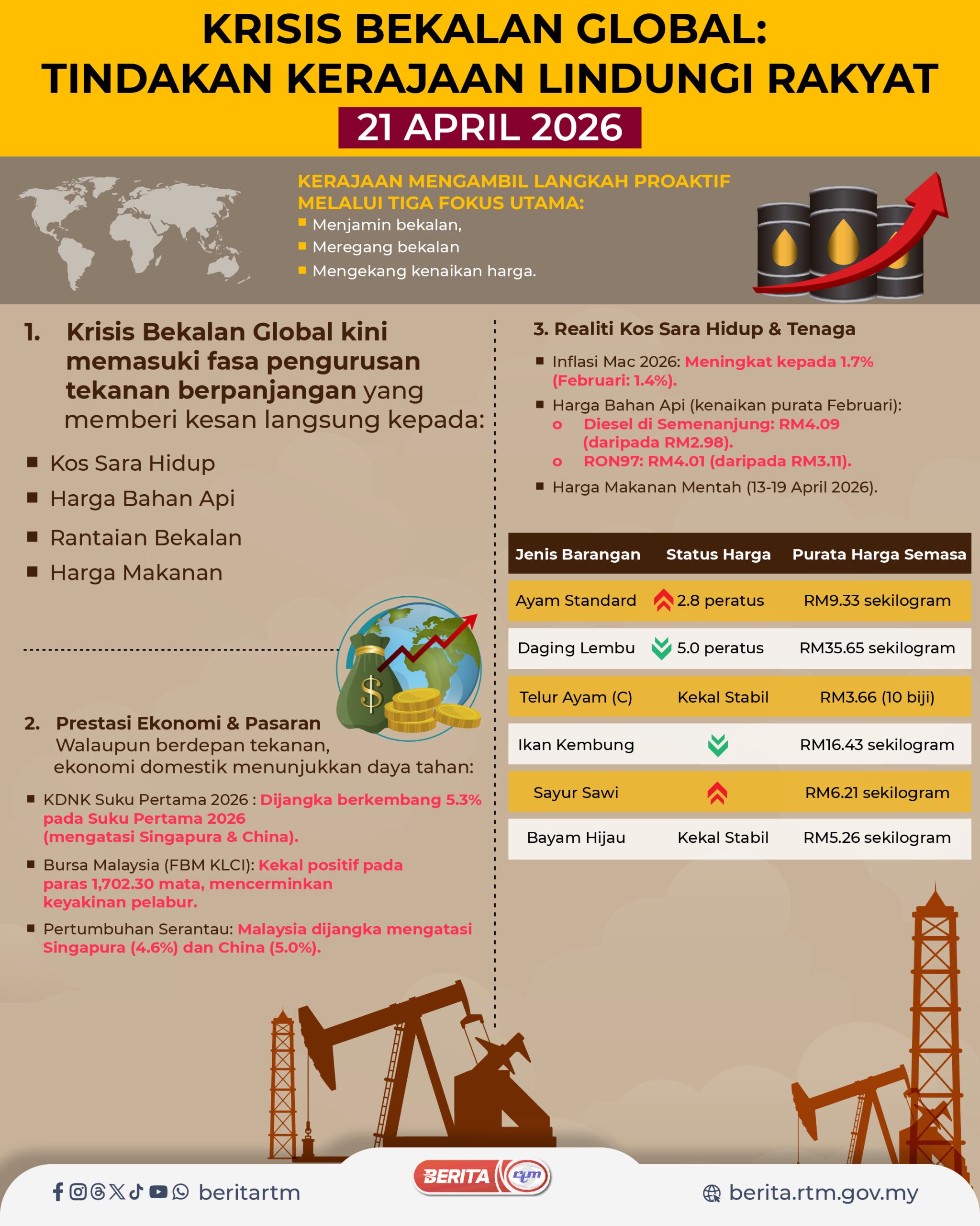 Utama Fokus Fakta Visual KRISIS BEKALAN GLOBAL: TINDAKAN KERAJAAN LINDUNGI RAKYAT (21 APRIL 2026) (1) KRISIS BEKALAN GLOBAL: TINDAKAN KERAJAAN LINDUNGI RAKYAT (21 APRIL 2026) (1)21/04/2026 | 11:18 pmFakta Visual Kongsi berita Share on X (Twitter) Share on Facebook Share on WhatsApp Share on Telegram Berita sebelumnyaKRISIS BEKALAN GLOBAL: TINDAKAN KERAJAAN LINDUNGI RAKYAT (21 APRIL 2026) ...Berita seterusnyaKOMPAUN PROGRAM REPATRIASI MIGRAN 2.0 RM114 JUTA Artikel Tajaan PALING POPULAR Jet peribadi terhempas, timbalan menteri dan empat maut Global Iran berjaya bedil USS Abraham Lincoln Global