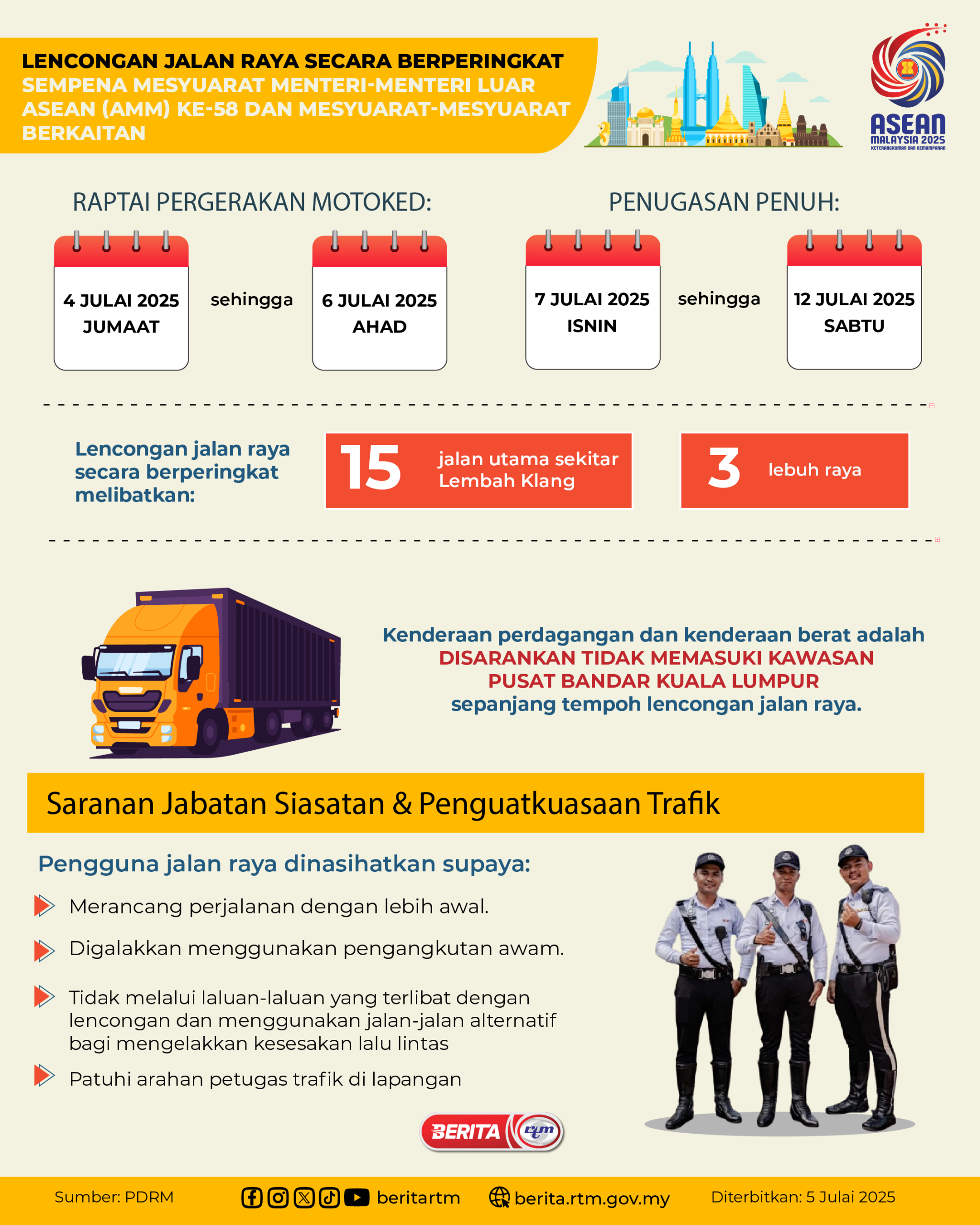 Utama Fokus Fakta Visual LENCONGAN JALAN RAYA SECARA BERPERINGKAT SEMPENA MESYUARAT MENTERI-MENTERI LUAR ASEAN (AMM) KE-58 DAN MESYUARAT-MESYUARAT BERKAITAN LENCONGAN JALAN RAYA SECARA BERPERINGKAT SEMPENA MESYUARAT MENTERI-MENTERI LUAR ASEAN (AMM) KE-58 DAN MESYUARAT-MESYUARAT BERKAITAN5/07/2025 | 4:28 pmFakta Visual Kongsi berita Share on X (Twitter) Share on Facebook Share on WhatsApp Share on Telegram Berita sebelumnyaLENCONGAN JALAN RAYA SECARA BERPERINGKAT SEMPENA MESYUARAT MENTERI-MENTERI LUAR ASEAN ...Berita seterusnyaKemudahan Pelaksanaan Peluasan Cukai Jualan & Perkhidmatan (SST). Pembiayaan khas BARAKAT dan BERKAT sempena Ramadan dan Tahun Baharu Cina Artikel Tajaan PALING POPULAR Jet peribadi terhempas, timbalan menteri dan empat maut Global Pemandu lori dipenjara 3 bulan, denda RM100,000 Kes