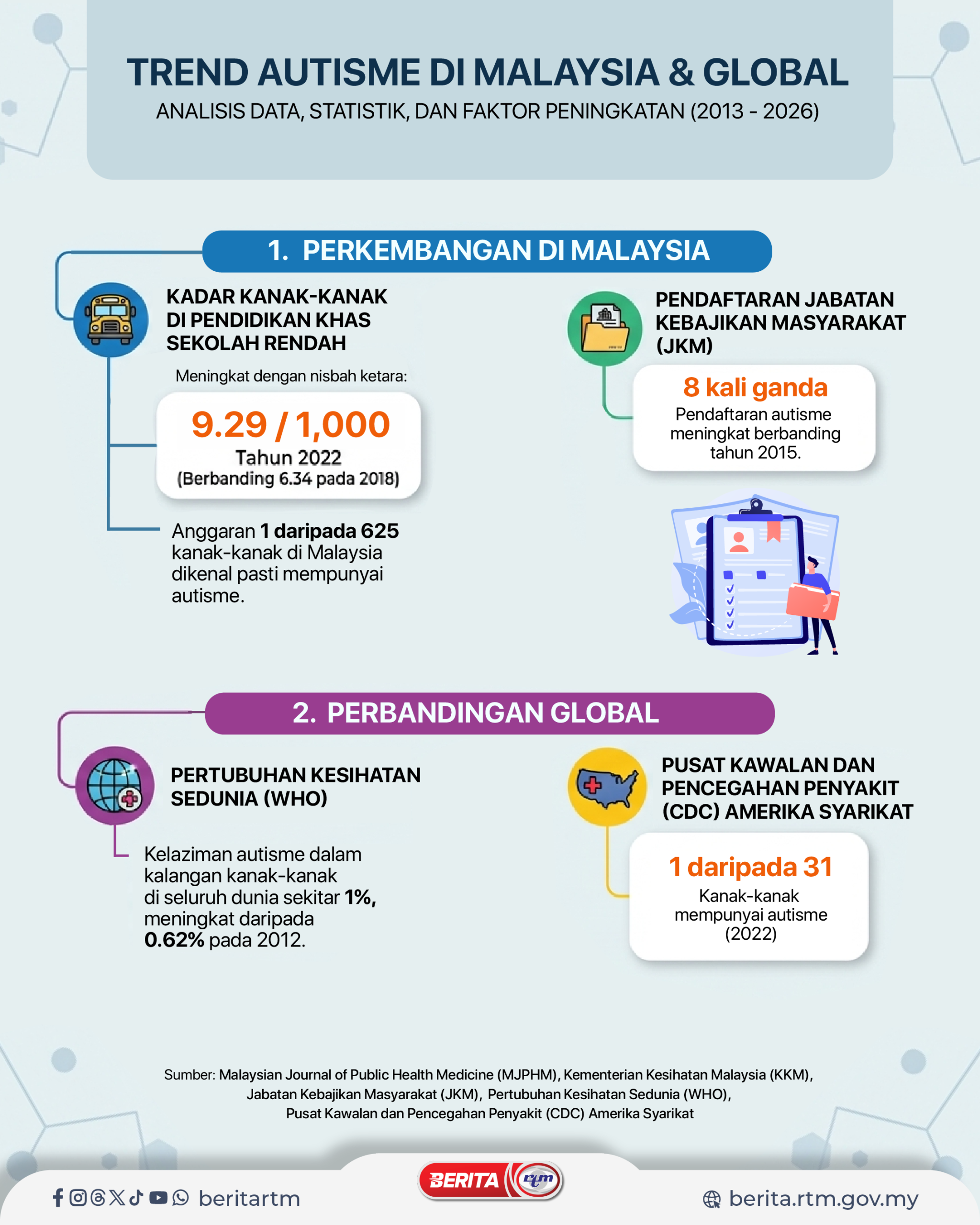 Utama Fokus Fakta Visual TREND AUTISME DI MALAYSIA & GLOBAL (1) TREND AUTISME DI MALAYSIA & GLOBAL (1)27/04/2026 | 7:08 pmFakta Visual Kongsi berita Share on X (Twitter) Share on Facebook Share on WhatsApp Share on Telegram Berita sebelumnyaTREND AUTISME DI MALAYSIA & GLOBAL (2)Berita seterusnyaMADANI BEKERJA 20 HINGGA 26 APRIL 2026 Ajinomoto (Malaysia) Berhad, MYKasih Memperkasa Generasi Masa Depan Menerusi Inisiatif Akuaponik Artikel Tajaan PALING POPULAR Jet peribadi terhempas, timbalan menteri dan empat maut Global Iran berjaya bedil USS Abraham Lincoln Global
