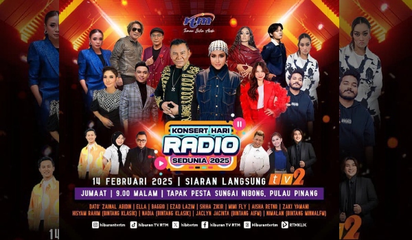 KUALA LUMPUR, 14 Februari- Konsert Hari Radio Sedunia 2025 terbitan khas Radio Televisyen Malaysia (RTM) akan diadakan hari ini pukul 9.00 malam di Tapak Pesta Sungai Nibong, Pulau Pinang.