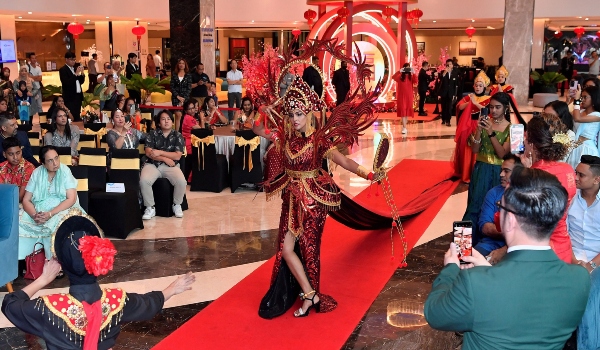 Kostum “Puteri Membara Malaysia” menggabungkan motif batik tradisional dan songket dengan sentuhan seni kontemporari, menyerlahkan kekayaan budaya Malaysia serta kreativiti dalam industri fesyen tempatan.