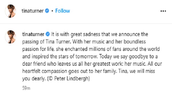 “Dengan rasa sedih kami mengumumkan pemergian Tina Turner,” menurut kenyataan di laman Instagram rasmi pemenang Grammy lapan kali itu.