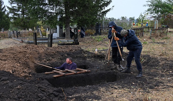 (Penduduk tempatan menggali kubur di tanah perkuburan di kampung Hroza, Kharkiv/AFP)