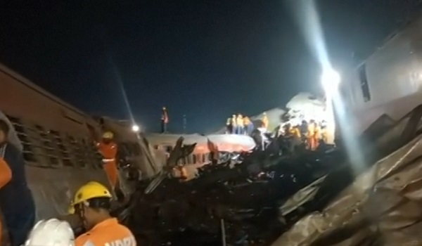 Foto yang disiarkan di stesen tempatan menunjukkan petak kereta api hancur dengan logam terpintal berhampiran Balasore, kira-kira 200 kilometer dari ibu negeri Bhubaneswar.