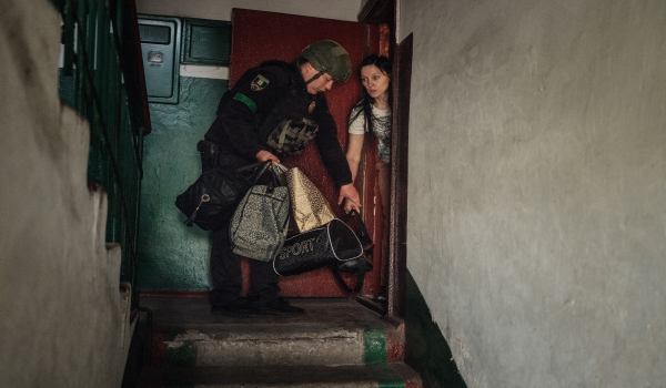 (Seorang wanita meninggalkan pangsapurinya diiringi pegawai polis untuk berpindah dari bandar Lyman timur Ukraine,