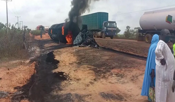 Kejadian berlaku apabila sebuah lori tangki petrol sarat dengan bahan api bertembung dengan lori treler yang sarat dengan penumpang dan lembu, kata kenyataan Sema sebelum ini.