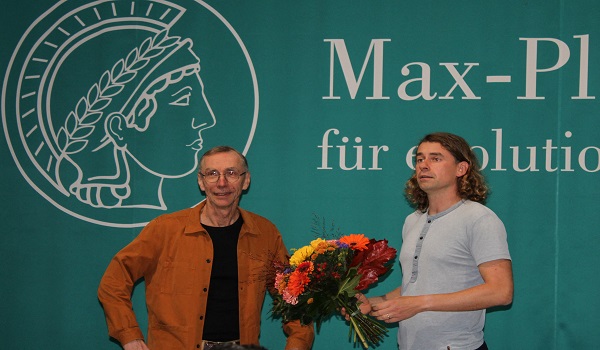 (Pengarah Institut Johannes Krause (kanan) mengucapkan tahniah kepada ahli paleogenetik Sweden
