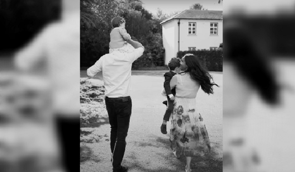 (Lilibet duduk di bahu ayahnya, Putera Harry, manakala Meghan