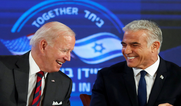 (Joe Biden dan Yair Lapid berbual ketika mereka menandatangani ikrar keselamatan di Hotel Waldorf Astoria di Baitulmaqdis, Israel/REUTERS)