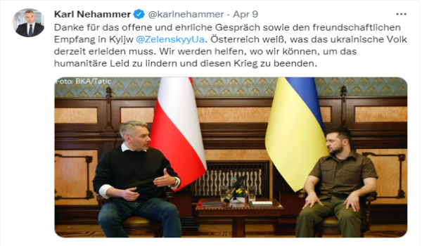 ZURICH, 11 April- Austria komited untuk menjadi ‘orang tengah’ bagi menjernihkan kemelut antara Rusia dan Ukraine sekali gus menghentikan peperangan berlarutan sejak 24 Februari lalu.