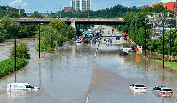 Sebahagian daripada Don Valley Parkway, lebuh raya utama di timur pusat bandar telah menyerupai sungai sejurus selepas hujan bermula, dengan imej menunjukkan kereta terhenti di dalam air banjir sedalam berpuluh-puluh cm.