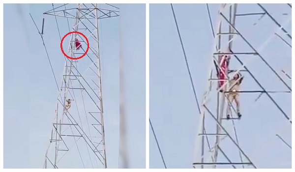 Seorang pegawai polis turut memanjat menara terbabit untuk memujuk Vandana untuk turun.